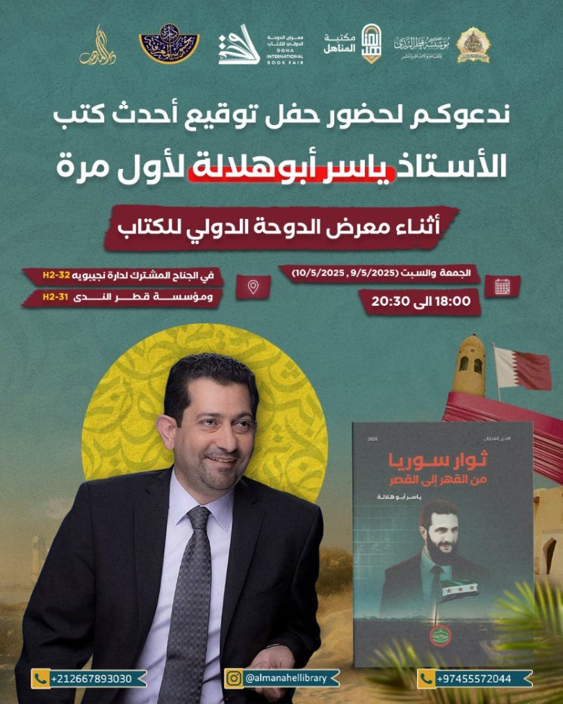 غدا في #معرض_الدوحة_الدولي_للكتاب حفل توقيع كتابي “ثوار سوريا من القهر إلى القصر “ من السادسة مساء إلى الثامنة والنصف روايتي للثورة السورية منذ 2011 في مقالتي وتغريداتي وأفلام وفيديوهات تجدونه في دار نشر قطر الندى احدى مؤسسات دارة نجيبويه